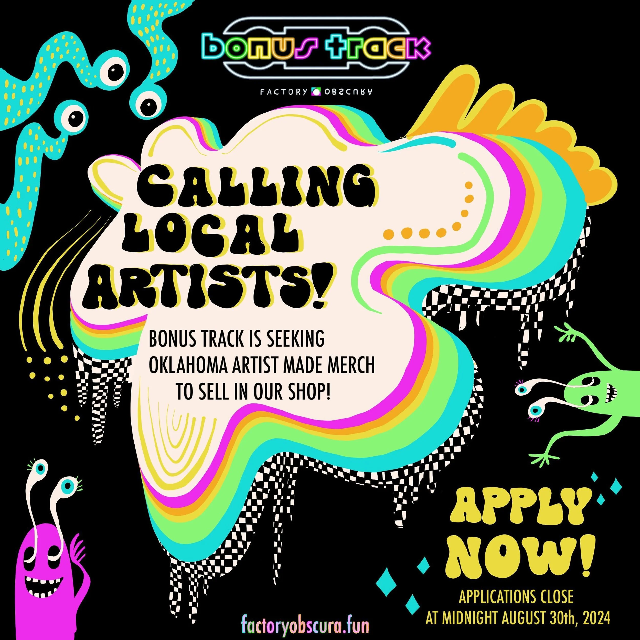 Part of the full Factory Obscura experience includes the local artist made and collaboratively branded merchandise available inside our BONUS TRACK store. Most of the artist made items have been made exclusively by Factory Obscura artists and some local art friends. Now we are looking to expand our offerings to include more handmade/handcrafted and artist designed merchandise from OKLAHOMA artists to sell within the MIX-TAPE Bonus Track shop-located in downtown OKC. Items are put on consignment (payout is 60% of retail price to the artist) .